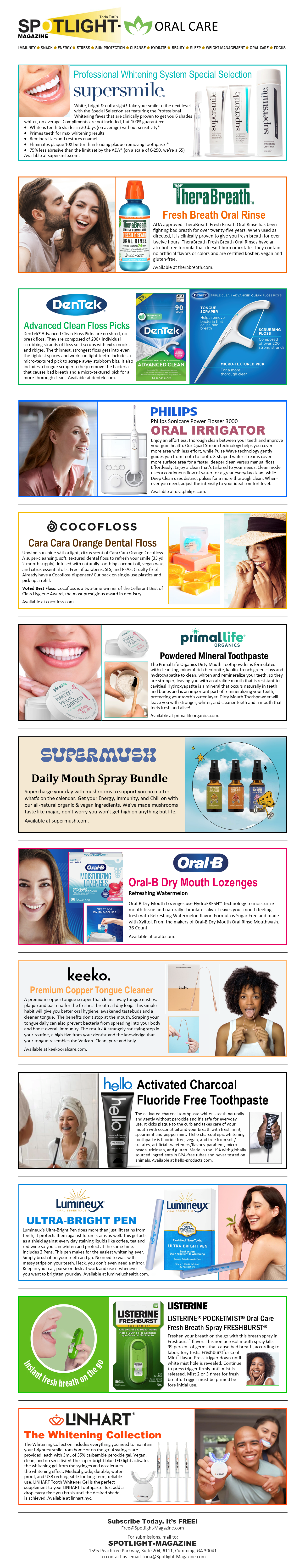 Spotlight-Magazine | Home Spotlight-Magazine | Immunity Spotlight-Magazine | Snack Spotlight-Magazine | Energy Spotlight-Magazine | Stress Spotlight-Magazine | Sun Protection Spotlight-Magazine | Cleanse Spotlight-Magazine | Hydrate Spotlight-Magazine | Beauty Spotlight-Magazine | Sleep Spotlight-Magazine | Weight Management Spotlight-Magazine | Oral Care Spotlight-Magazine | Focus SupersmileWhiteningSystem TheraBreathOralRinse DentekFlossPicks PhilipsOralIrrigator CocoFlossDentalFloss PrimalLifeOrganicsPowderedMineralToothpaste SuperMushMouthSprayBundle OralBDryMouthLozenges KeekoCopperToungeCleaner HelloCharcoalToothpaste LumineuxUltraBrightPen ListerineBreathSpray LinhartWhiteningCollection