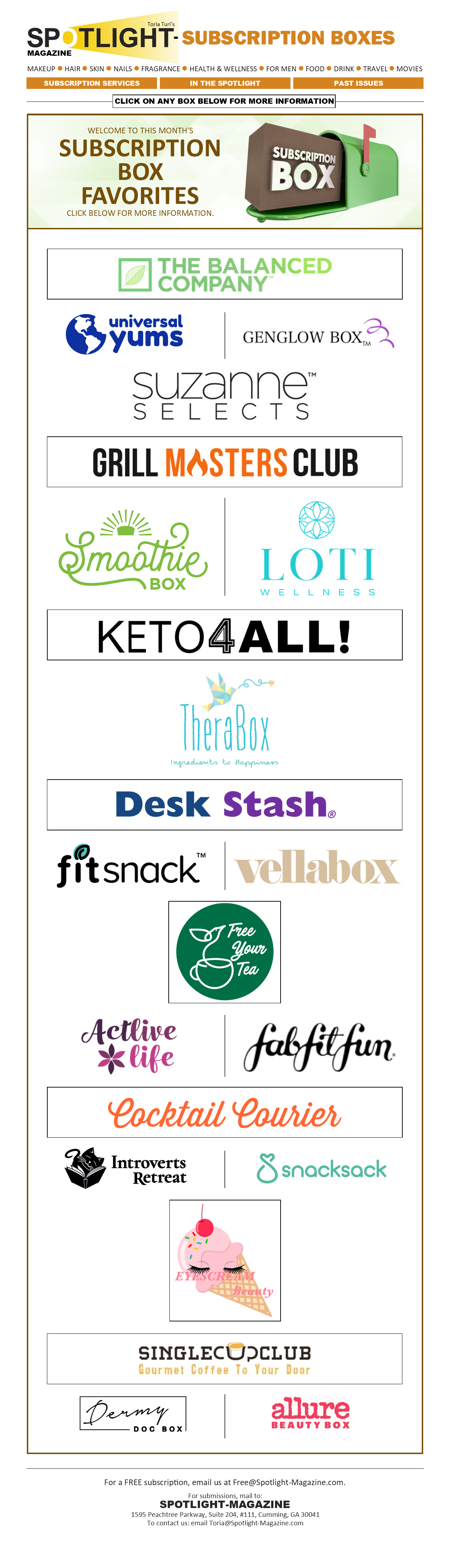Spotlight-Magazine Spotlight-Magazine | Makeup Spotlight-Magazine | Hair Spotlight-Magazine | Skin Spotlight-Magazine | Nails Spotlight-Magazine | Fragrance Spotlight-Magazine | Health & Wellness Spotlight-Magazine | For Men Spotlight-Magazine | Food Spotlight-Magazine | Drink Spotlight-Magazine | Travel Spotlight-Magazine | Movies Spotlight-Magazine | Subscription Services Spotlight-Magazine | In The Spotlight Spotlight-Magazine | Past Issues THE BALANCED COMPANY UNIVERSAL YUMS GENGLOW BOX SUZANNE SELECTS GRILL MASTERS CLUB SMOOTHIE BOX LOTTI WELLNESS KETO4ALL KETO SNACK BOX THERABOX DESK STASH DESK STASH FITSNACK VELLA BOX FREE YOUR TEA ACTIVE LIFE FABFITFUN COCKTAIL COURIER INTROVERTS RETREAT SNACKSACK EYE SCREAM SINGLE CUP CLUB DERMY DOC BOX ALLURE BEAUTY BOX Leave Me A Message Let Me Know When Its Ready